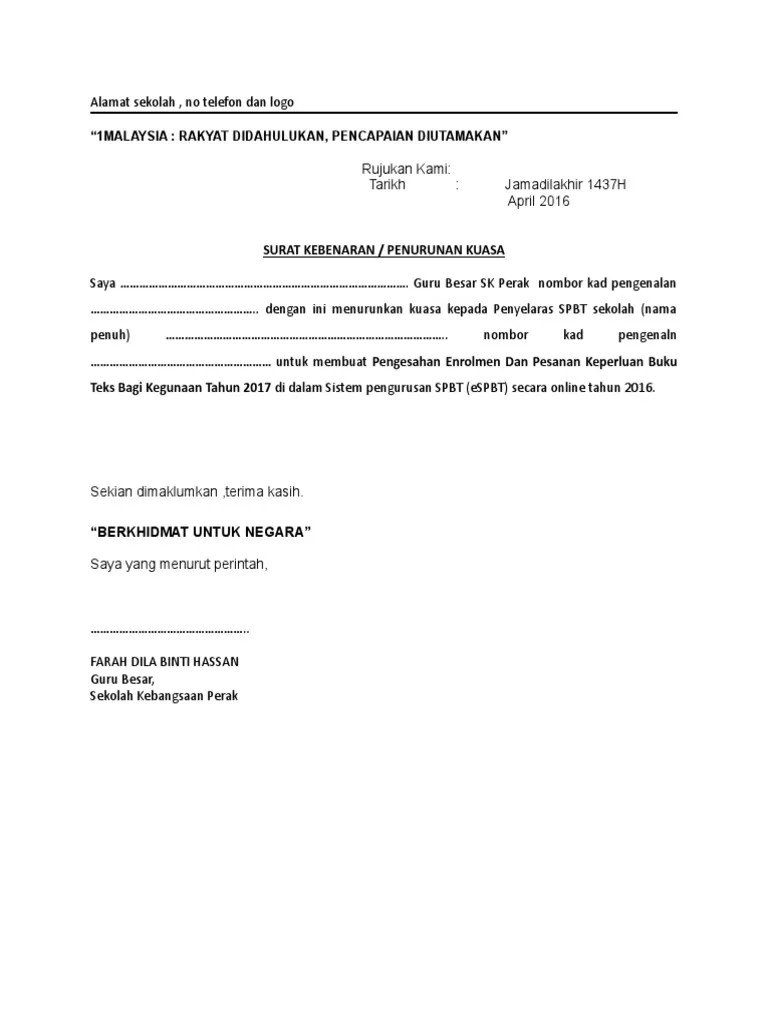 Surat Turun Kuasa Spbt - 2. Untuk membuat pengesahan enrolmen dan pesanan keperluan buku teks bagi kegunaan tahun 2017 di dalam sistem pengurusan spbt (espbt) secara online tahun 2016. Contoh surat kuasa merotan download kumpulan gambar. Menurunkan kuasa kepada penyelaras spbt sekolah. Rakyat didahulukan, pencapaian diutamakanâ rujukan kami: Lampiran 11 contoh surat penurunan kuasa pengetua. 17 april 2015 surat kebenaran / penurunan kuasa saya . Pengurusan spbt (espbt) secara online tahun 2017.